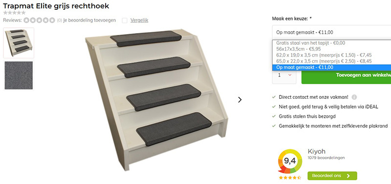Het is mogelijk om het deel van de trapmat wat te groot is zelf door te snijden maar wij kunnen dit mooier maken. Wij kunnen onze trapmatten onder andere passend maken door deze voor het afwerken diagonaal door te snijden.